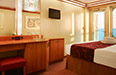 Occupancy: 2 A relaxing retreat with discreet and convenient access to the largest spa at sea. Samsara Inside Staterooms have two twin beds that convert to a queen-sized bed, flat screen television, ... Read More A relaxing retreat with discreet and convenient access to the largest spa at sea. Samsara Inside Staterooms have two twin beds that convert to a queen-sized bed, flat screen television, generous closet space, desk, and a private bathroom with shower. Each stateroom also has PlayStation on demand, satellite television, thermostat controlled air-conditioning, direct-dial telephone, hair dryer, mini bar, individual safe, and 24 hour room service. Special Samsara Stateroom Amenities: Unlimited access to the spa, in-cabin breakfast, the Brindiamo beverage package, a purifying shower filter, an aromatic essence diffuser and a kettle with a selection of aromatic teas. Guests who choose a Samara cabin also receive a 10% discount on their next cruise. Some staterooms are equipped with an upper Pullman-style bunk bed(s) to accommodate a third or fourth guest. Read Less Cabin Size: 150 sq ft
