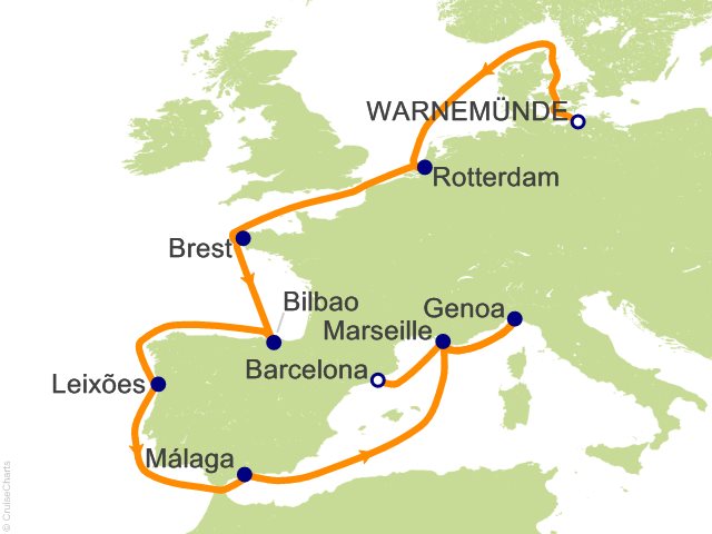 From Warnemunde, (Germany) to Barcelona, (Spain)